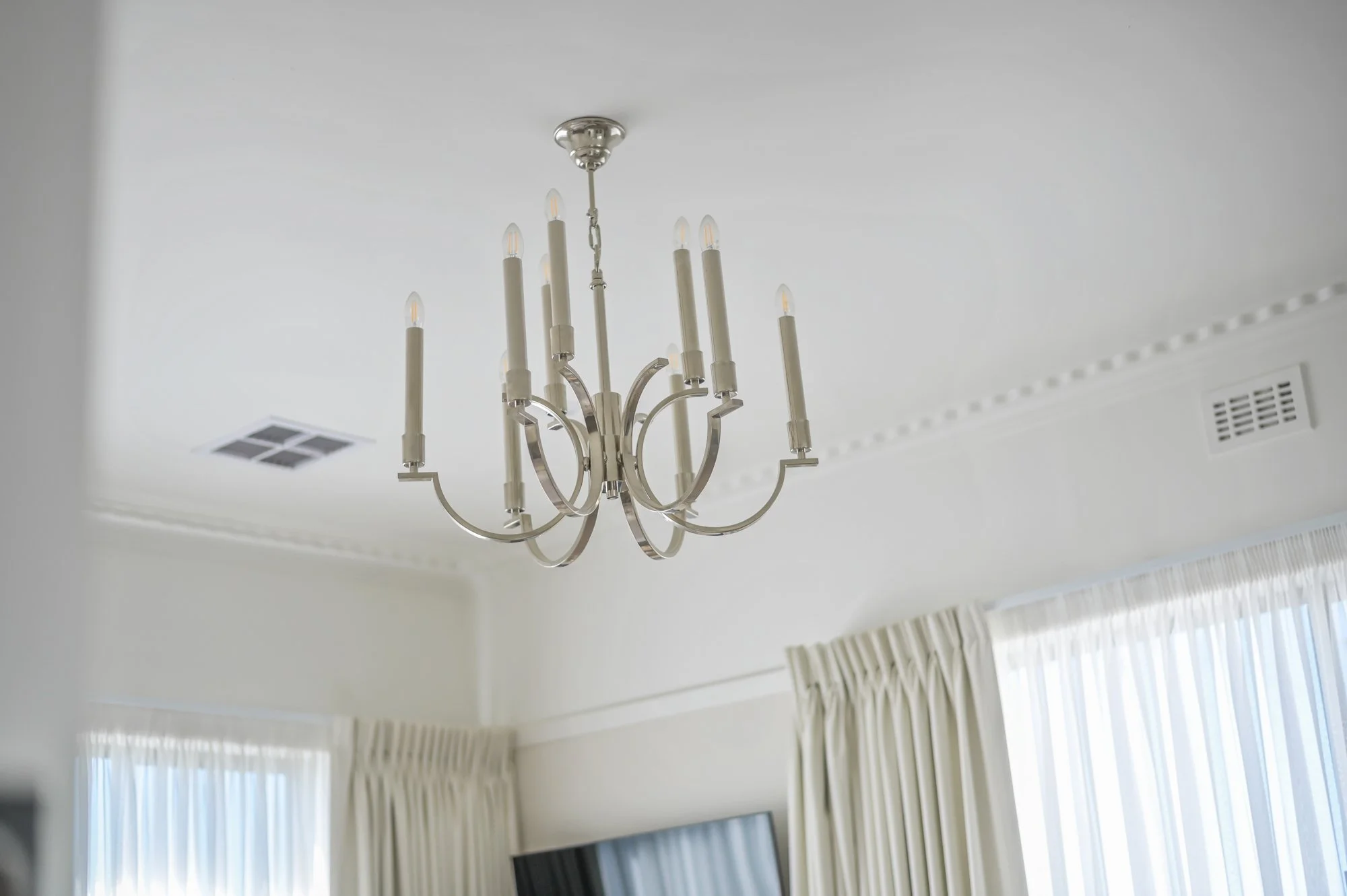 A well curated lighting design elevates this master bedroom suite with the gorgeous Leon 9 Light pendant in Polished Nickel from Beacon Lighting.